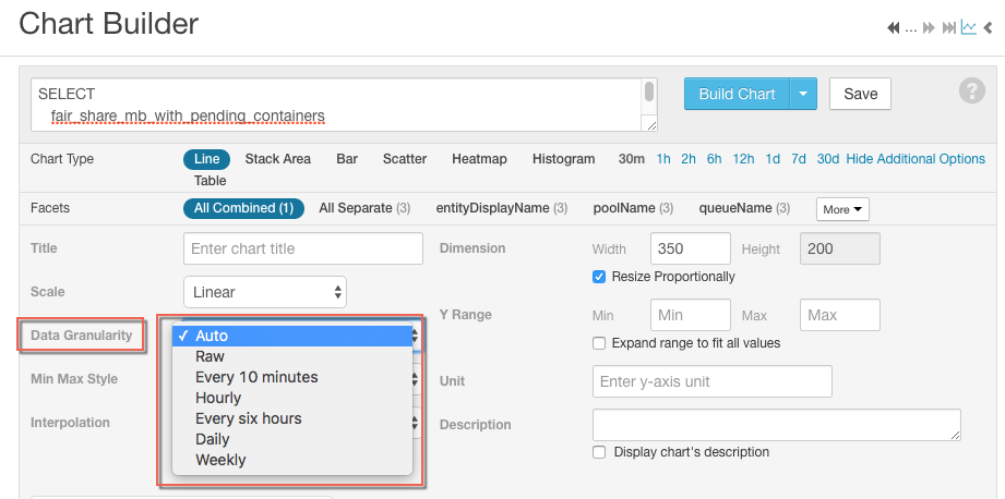 The yarn_reports_containers_used_cpu metric used in this tsquery is generated per hour, therefore the data granularity used for this query is the raw metric value.