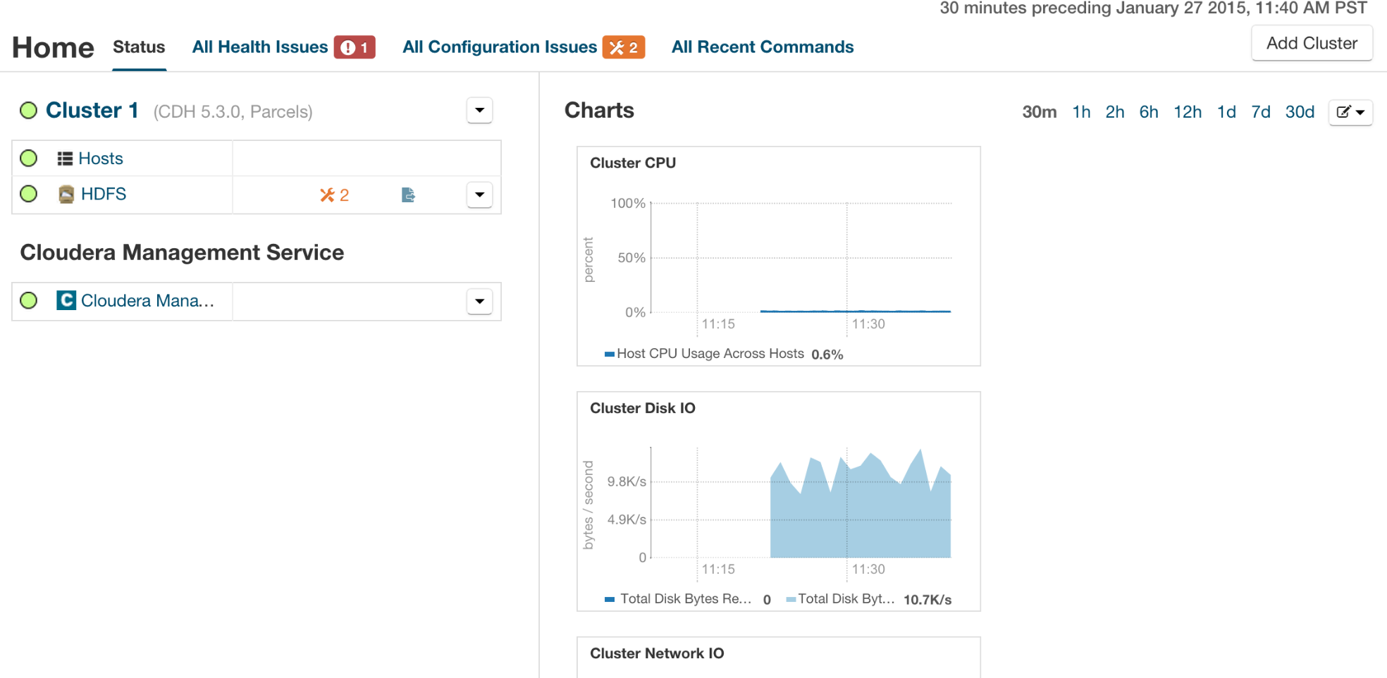 Management Service as reported in the Cloudera Manager Admin Console. The health status indicators should be green, as shown:
