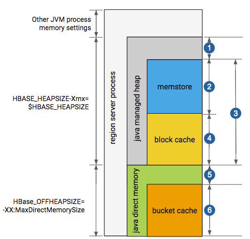 <property> <name>hbase.bucketcache.combinedcache.enabled</name> <value>true</value> </property> <property> <name>hbase.bucketcache.ioengine</name> <value>offheap</value> </property> <property> <name>hbase.bucketcache.size</name> <value>8388608</value> </property> <property> <name>hfile.block.cache.size</name> <value>0.2</value> </property> <property> <name>hbase.regionserver.global.memstore.size</name> <value>0.6</value> </property>