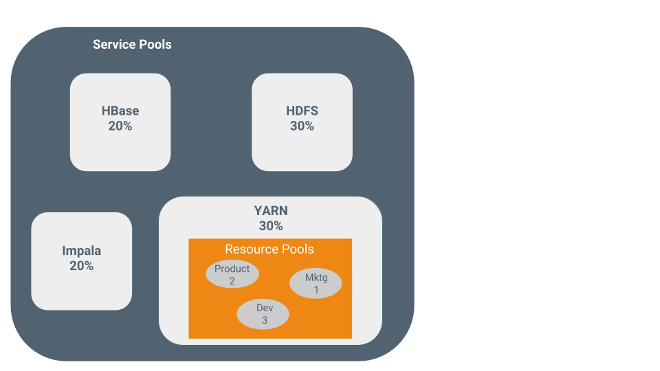 - YARN - YARN manages the virtual cores, memory, running applications, maximum resources for undeclared children (for parent pools), and scheduling policy for each pool. In the preceding diagram, three dynamic resource pools—Dev, Product, and Mktg with weights 3, 2, and 1 respectively—are defined for YARN. If an application starts and is assigned to the Product pool, and other applications are using the Dev and Mktg pools, the Product resource pool receives 30% x 2/6 (or 10%) of the total cluster resources. If no applications are using the Dev and Mktg pools, the YARN Product pool is allocated 30% of the cluster resources.