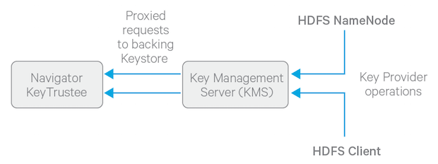 The diagram below illustrates how HDFS clients and the NameNode interact with an enterprise keystore through the Hadoop Key Management Server. The keystore can be either the Cloudera Navigator Key Trustee Server or a support HSM.