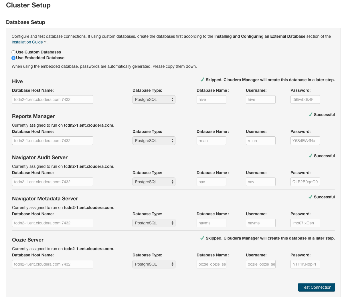 - Keep the default setting of Use Embedded Database to have Cloudera Manager create and configure required databases. Record the auto-generated