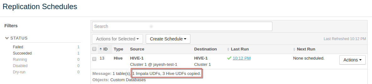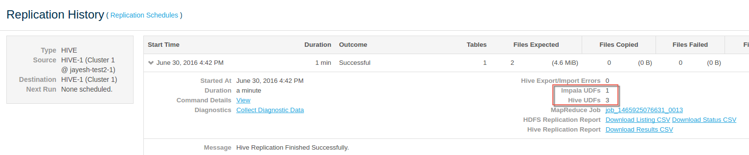 After a replication has run, you can see the number of Impala and Hive UDFs that were replicated during the last run of the schedule on the Replication