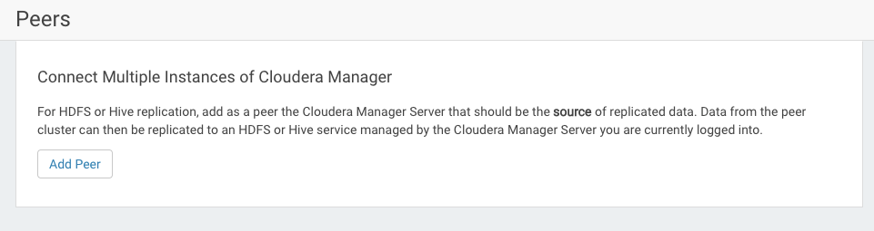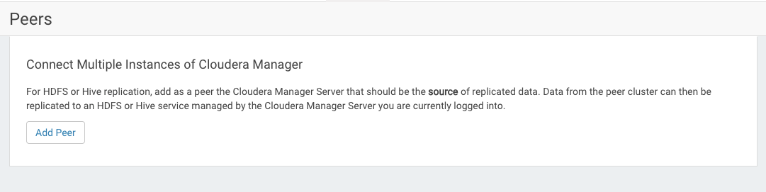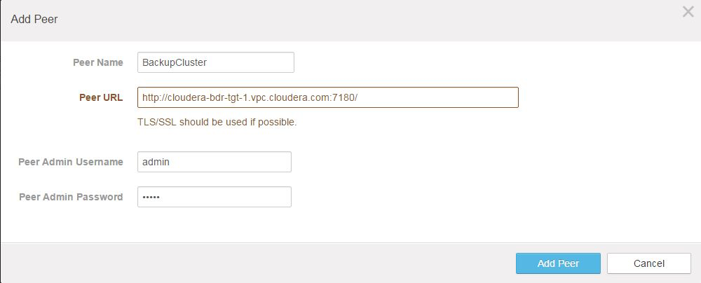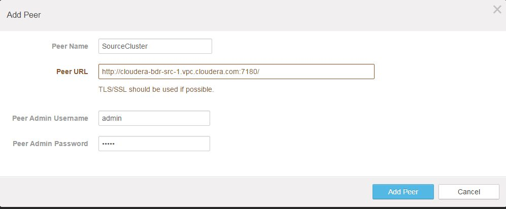 - Peer URL - Enter the URL for the Cloudera Manager Admin Console running on the master node of the cluster.