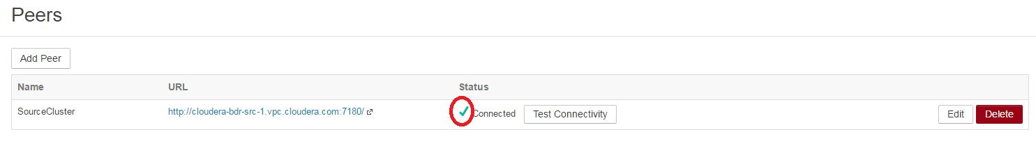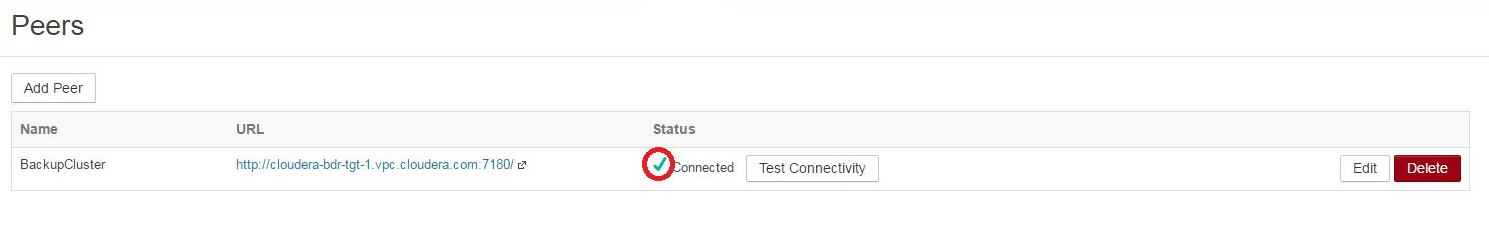 - Click Add Peer to save the settings, connect to the backup cluster, and establish the peer relationship.
