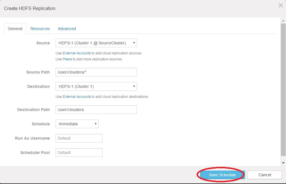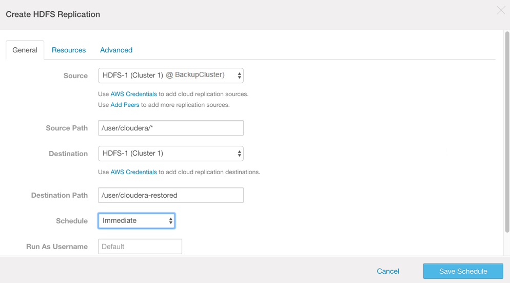 With the peer relationship established from destination to source, create a schedule to replicate HDFS files from the source (production cluster) to the destination (backup cluster).