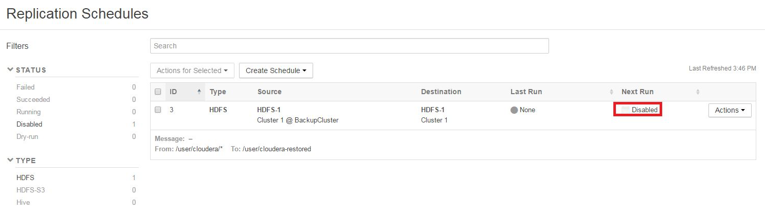 At this point, until you need to actually restore production HDFS data files, you can leave the Replication Schedule disabled.