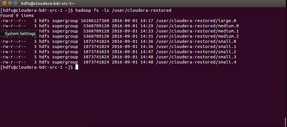 To manually verify that your data has been restored to the source cluster, you can use the HDFS File Browser or the hadoop command-line, as shown here:
