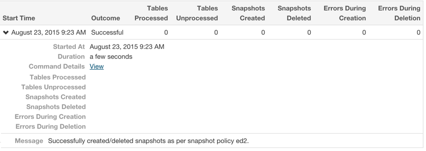 Click Click the View link to open the Managed scheduled snapshots Command page, which displays details