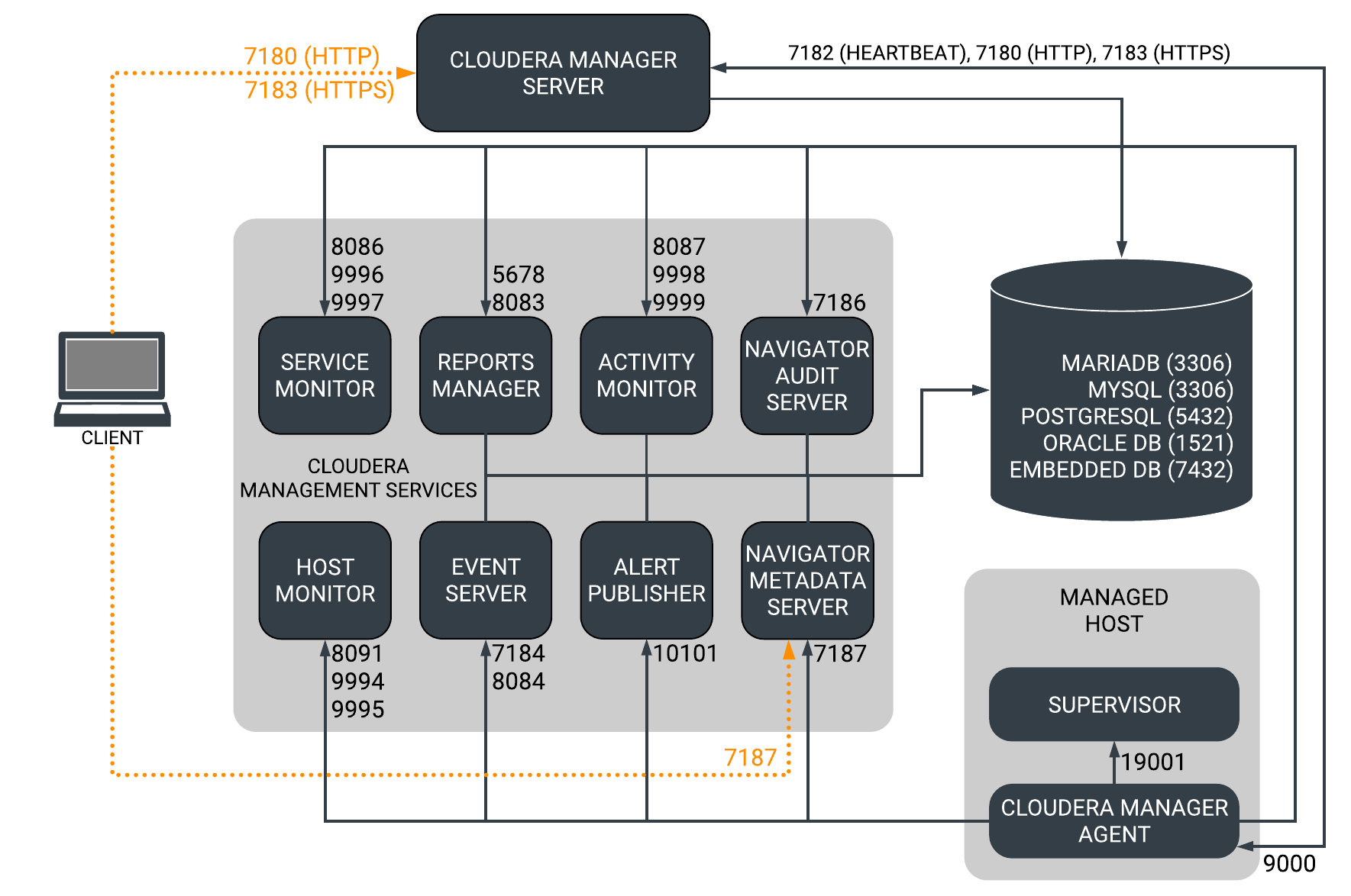 The following diagram provides an overview of some of the ports used by Cloudera Manager, Cloudera Navigator, and Cloudera Management Service roles: