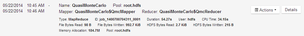 If you run the PiEstimator job on the YARN service (the default) you will see an entry like the following in yarn Applications: