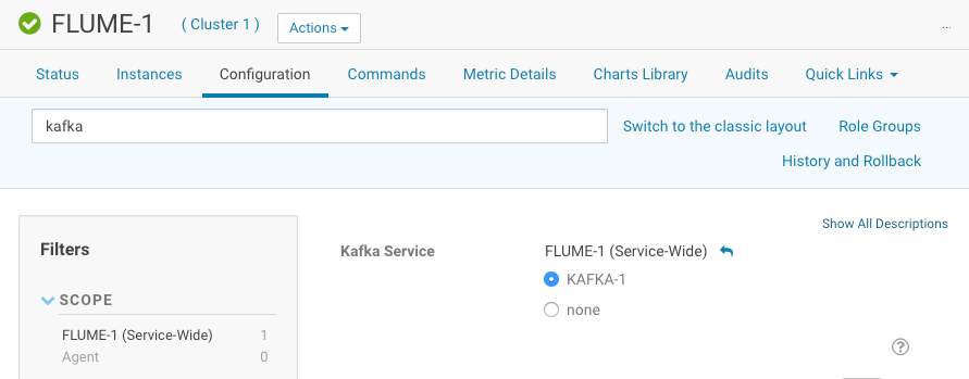 Use the Search field to search for Kafka. The Kafka Service property is displayed. Select the Kafka service that you want the Flume service to connect to.
