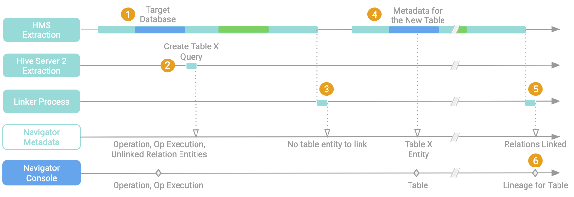 - Query engines such as Hive Server 2 push metadata updates to Navigator as soon as an event occurs: In this example, a query that creates table X is pushed to Navigator and Navigator creates an operation entity and an operation execution entity to represent the query. Navigator creates lineage relationship entities for the new table, but the relationships are left "unlinked" because the new table doesn't yet exist in Navigator.