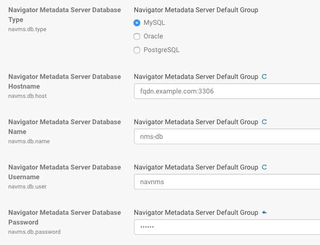 Here is an example of a configured custom (external) database instance that uses MySQL for the Navigator Metadata Server database: