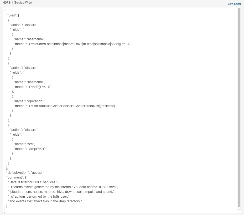 Cloudera Manager Agent uses this property to filter events out before they are sent to Cloudera Navigator. The default filter settings discard the following events: