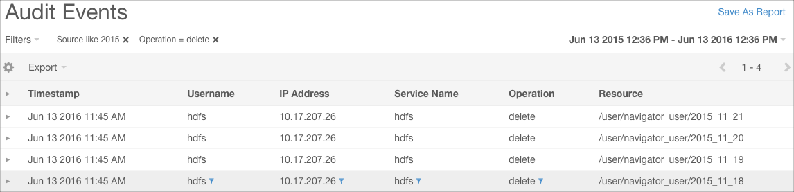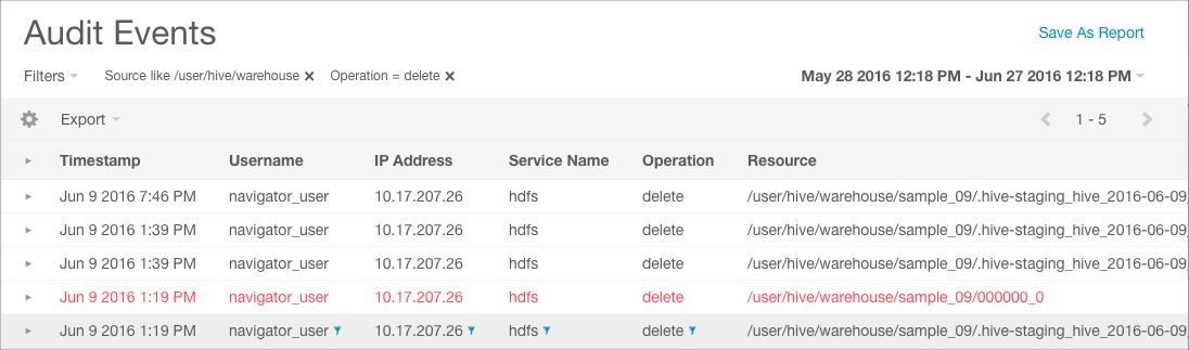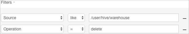 - Click Apply. The filter to select delete operations is added to the list of filters and applied to Audit Events. An updated Audit Events list is returned, showing only delete operations for sources similar to /user/hive/warehouse.