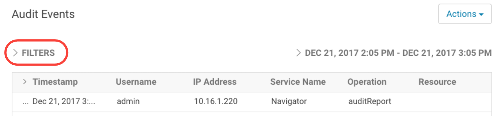 You filter audit events by specifying a time range or adding one or more filters containing an audit event field, operator, and value.