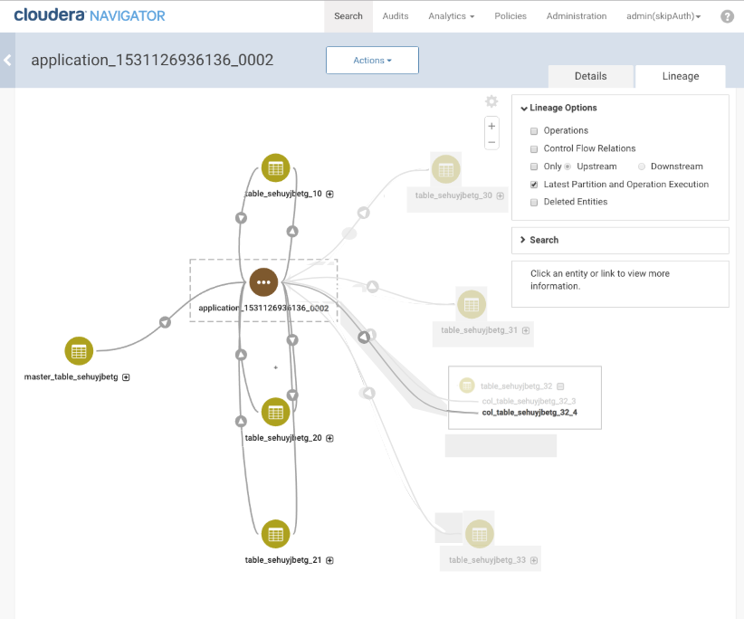 Navigator shows lineage diagrams for operations performed by compute engines such as MapReduce v1, YARN (MRV2), or Spark (all Spark 1 versions and Spark 2 starting with version 2.3). Lineage reflects data processed using Spark SQL, including the Datasets/Dataframe APIs. Other services such as Apache Sqoop contribute metadata that Navigator can use to create lineage diagrams as well.