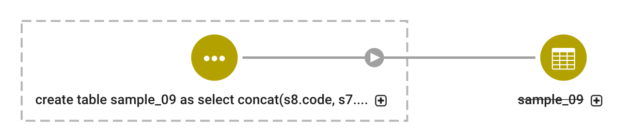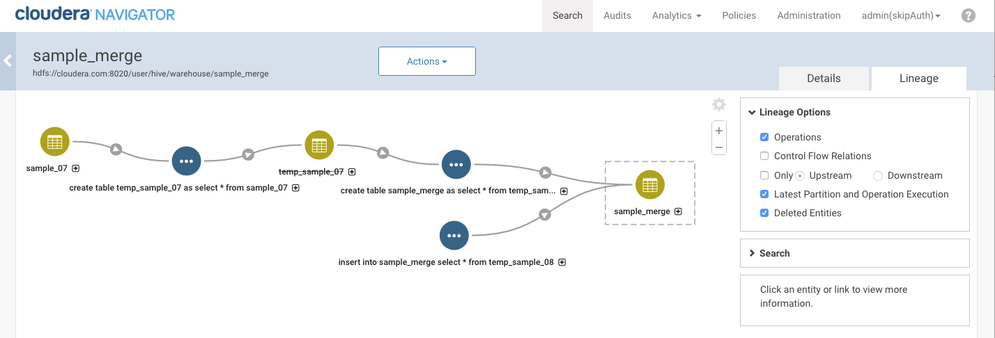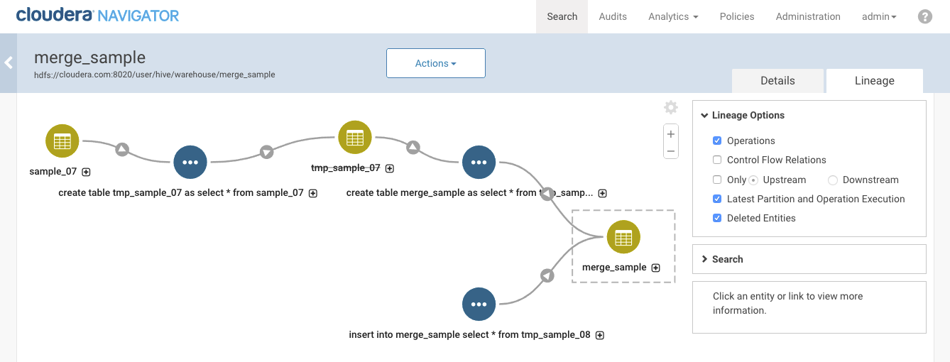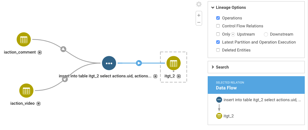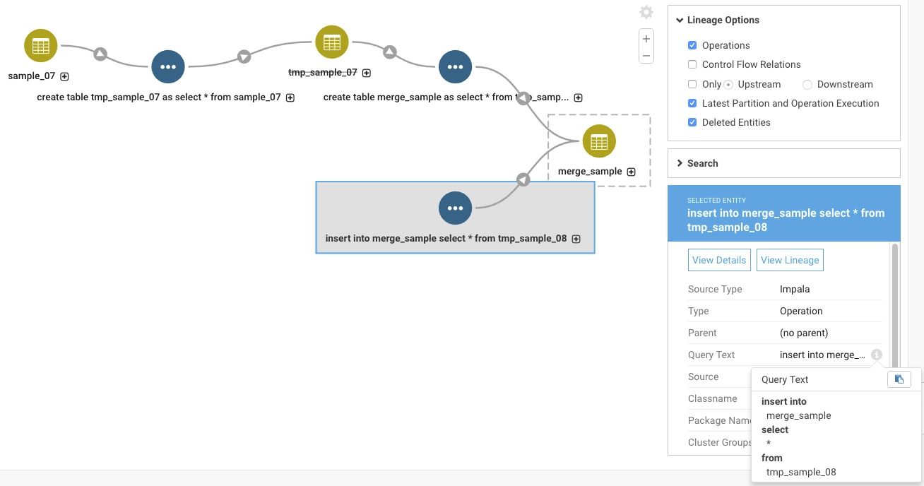 If the first table is created and deleted between Navigator-HMS extractions, no metadata entity is created for the table, and the operation details don't link up to an existing entity as an operation input (unlinked relation). If you look at the lineage diagram for the second table and turn on the option to show operations, you'll see the operation that created the second table, but you won't see the first table. In the lineage view, you can see the query run by the operation. That query text shows the first table in the FROM clause.
