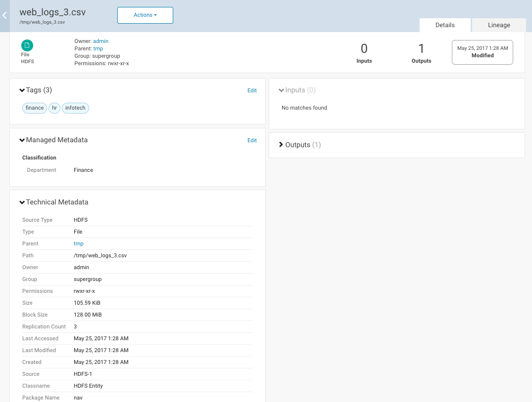 - The technical metadata was extracted from the source system, in this example, HDFS.