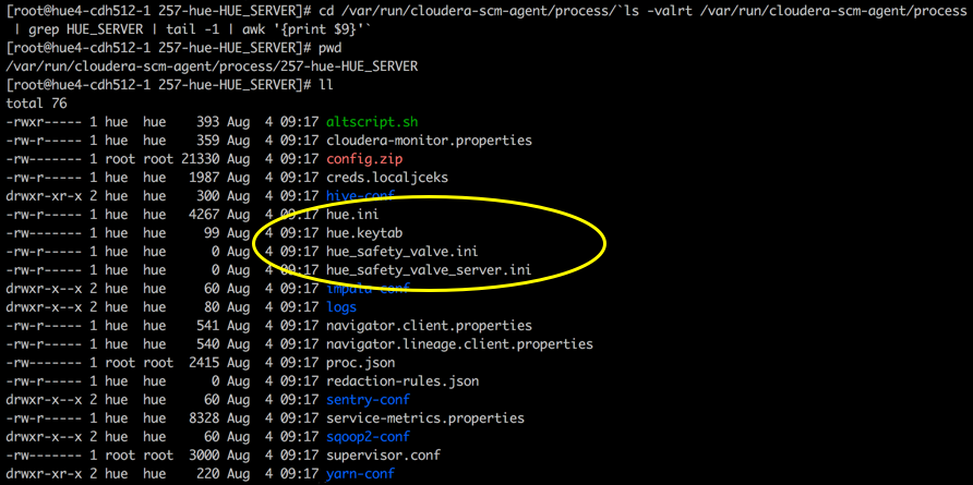 Important: Do not edit the .ini files at the command line because they are stored in dynamic directories named by process ID and populated from the Cloudera Manager database.ls -ltr /var/run/cloudera-scm-agent/process/`ls -valrt /var/run/cloudera-scm-agent/process | grep HUE_SERVER | tail -1 | awk '{print $9}'`