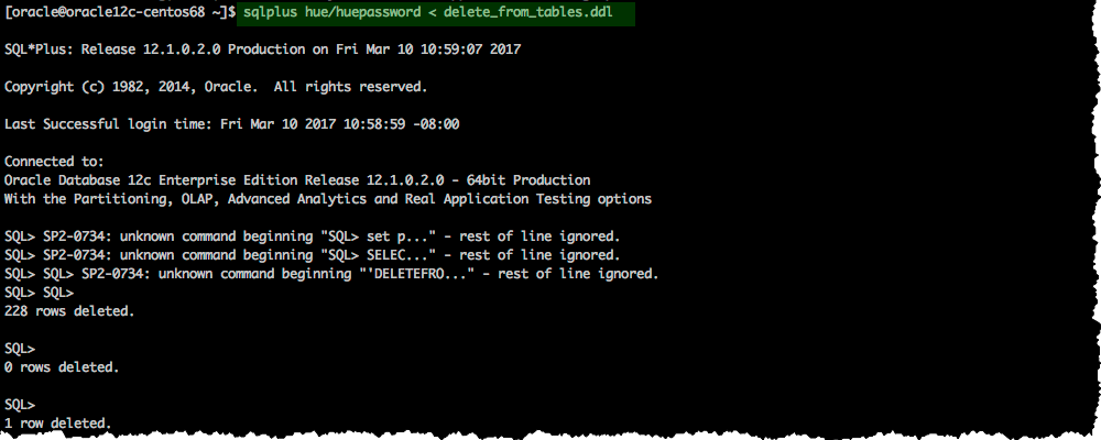 ## Create delete_from_tables.ddl sqlplus hue/<your hue password> < spool_statements.ddl ## Run delete_from_tables.ddl sqlplus hue/<your hue password> < delete_from_tables.ddl