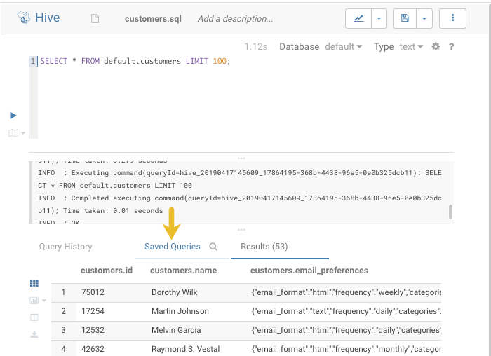 Hive to install sample databases. - In the left panel, click the default database and the customers sample table.