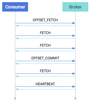 When consuming, the first step is to query where should the consumer start. This is done in the OFFSET_FETCH request. This is not mandatory: the consumer can also provide the offset manually. After this, the consumer is free to pull data from the broker. Data consumption happens in the FETCH requests. These are the long-pull requests. They are answered only when the broker has enough data; the request can be outstanding for a longer period of time.