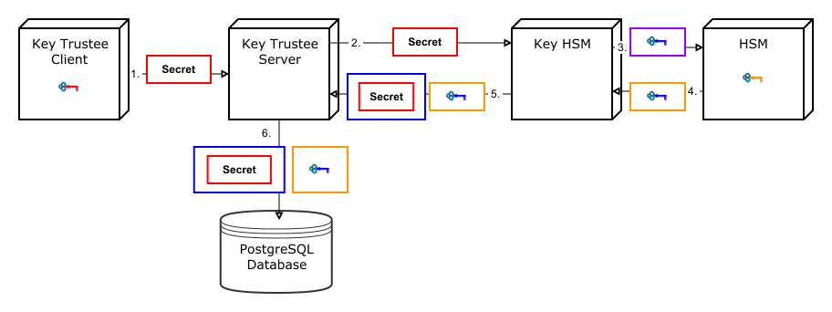 - Key Trustee Server stores the twice-encrypted secret along with the encrypted symmetric key in its PostgreSQL database.