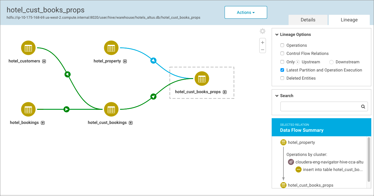 Cloudera Navigator can collect metadata from clusters running on Cloudera Altus and from objects stored on Amazon S3. That means that the entities resulting from Hive jobs, for example, running on clusters instantiated by Cloudera Altus users can be seen in lineage diagrams in a centralized on-premises Cloudera Navigator instance running on a persistent or long-running Cloudera Manager cluster.