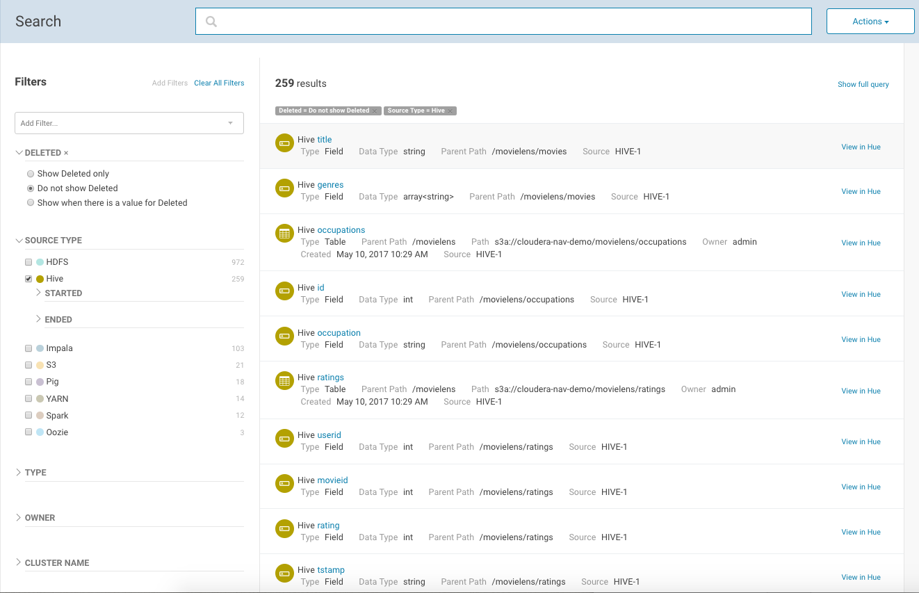 Click the value next to the Hive Tables heading (in this case, 103.9K) to view matching tables in Search.
