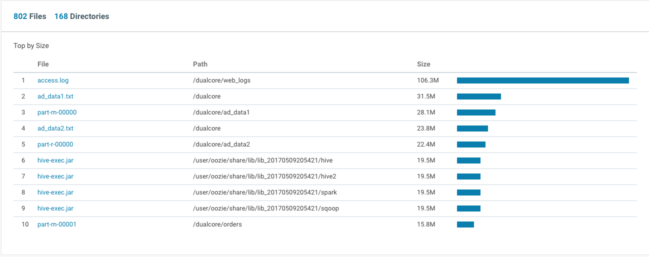 The bar graph displays the top 20 files, based on size. Hover over the bar in the graph to see information about that file. Click the bar to open the Details page for that file.