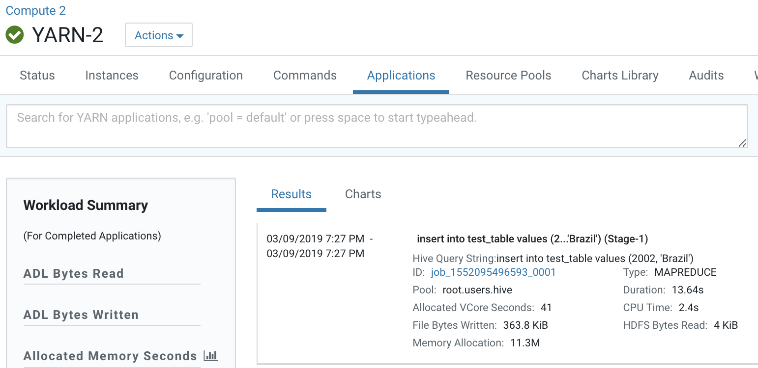 - Verify and track the Yarn job submitted by the Hive Execution Service using the Cloudera Manager Admin Console by going to .