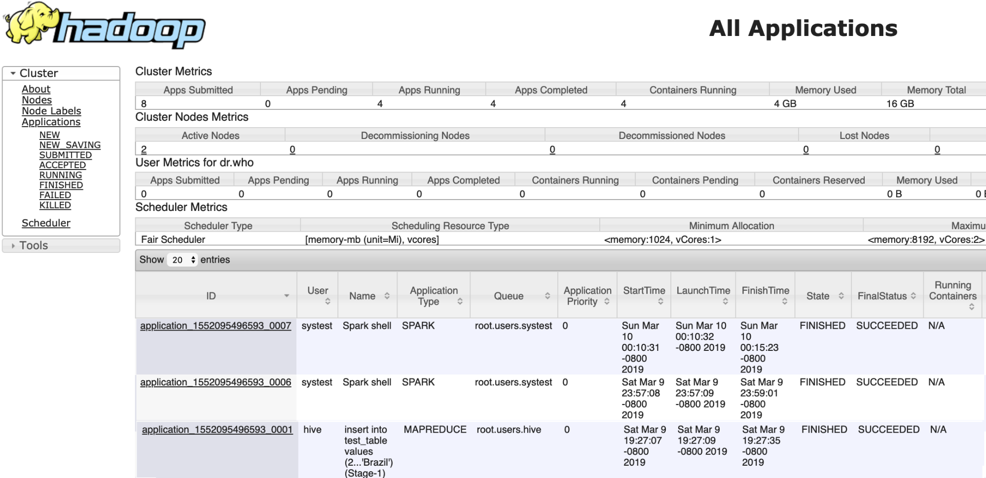 scala> val tableTestData = sqlContext.sql("select * from test_data.test_table") tableTestData: org.apache.spark.sql.DataFrame = [year: int, winner: string] scala> tableTestData.show() +----+-------+ |year| winner| +----+-------+ |2002| Brazil| |2018| France| |2014|Germany| |2010| Spain| |2006| Italy| |1998| France| +----+-------+ - Verify and track the queries in the Yarn service application on the Compute cluster: