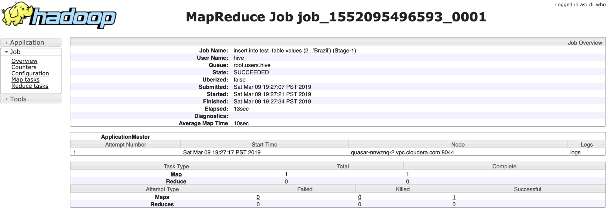 INFO : Compiling INFO : Executing command(queryId=hive_20190309192705_218b79aa-aa94-4102-95ab-a1d4bc7a0381): insert into test_table values (2002, 'Brazil') WARN : INFO : Query ID = hive_20190309192705_218b79aa-aa94-4102-95ab-a1d4bc7a0381 INFO : Total jobs = 3 INFO : Launching Job 1 out of 3 INFO : Starting task [Stage-1:MAPRED] in serial mode INFO : Submitting tokens for job: job_1552095496593_0001 INFO : The url to track the job: https://vpc_host-nnwznq-1.tut.myco.com:8090/proxy/application_1552095496593_0001/ INFO : Starting Job = job_1552095496593_0001, Tracking URL = https://vpc_host-nnwznq-1.tut.myco.com:8090/proxy/application_1552095496593_0001/ hdfs://ns1/user/hive/warehouse/test_data.db/test_table/.hive-staging_hive_2019-03-09_19-27-05_193_3963732700280111926-1/-ext-10000 from hdfs://ns1/user/hive/warehouse/test_data.db/test_table/.hive-staging_hive_2019-03-09_19-27-05_193_3963732700280111926-1/-ext-10002 INFO : Starting task [Stage-0:MOVE] in serial mode INFO : Loading data to table test_data.test_table from hdfs://ns1/user/hive/warehouse/test_data.db/test_table/.hive-staging_hive_2019-03-09_19-27-05_193_3963732700280111926-1/-ext-10000 INFO : MapReduce Jobs Launched: INFO : Stage-Stage-1: Map: 1 Cumulative CPU: 2.4 sec HDFS Read: 4113 HDFS Write: 88 HDFS EC Read: 0 SUCCESS INFO : Total MapReduce CPU Time Spent: 2 seconds 400 msec INFO : Completed executing command(queryId=hive_20190309192705_218b79aa-aa94-4102-95ab-a1d4bc7a0381); Time taken: 31.097 seconds INFO : OK 1 row affected (31.434 seconds)