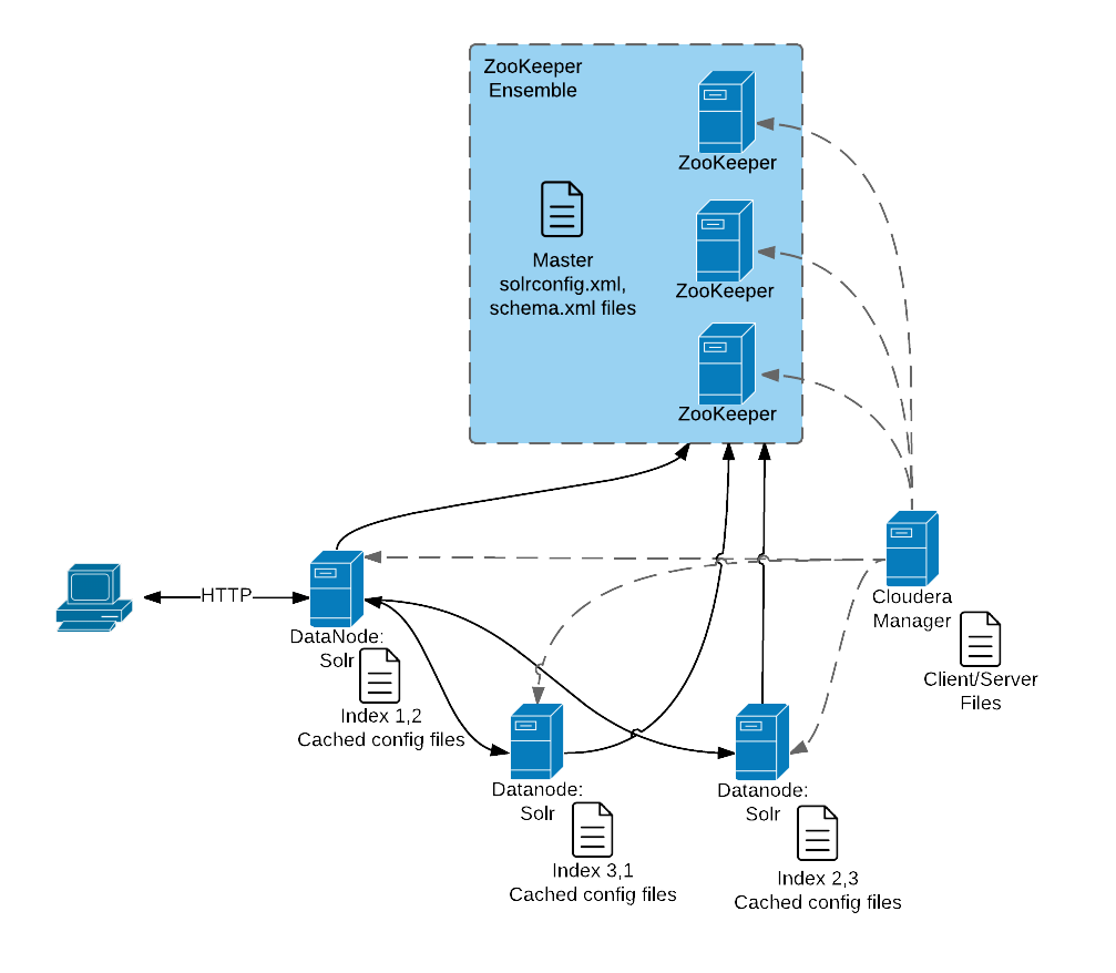 - Solr config files stored in ZooKeeper. Copies of these files exist on all Solr servers: