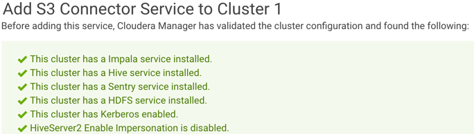 With Cloudera Manager and CDH 5.10+ clusters, the S3 Connector Service automates the authentication process to Amazon S3 for Impala, Hive, and Hue, the components used for business-analytical use cases designed to run on persistent multi-tenant clusters.