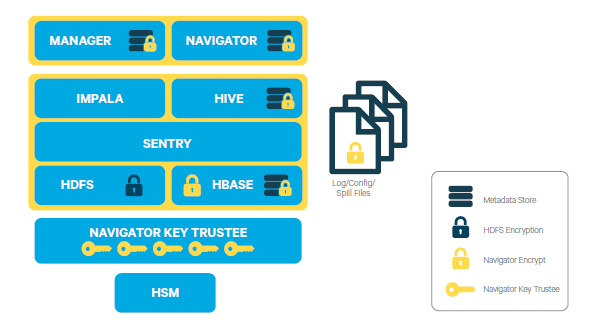 - Navigator Encrypt for all other data (including metadata, logs, and spill data) associated with Cloudera Manager, Cloudera Navigator, Hive, and HBase