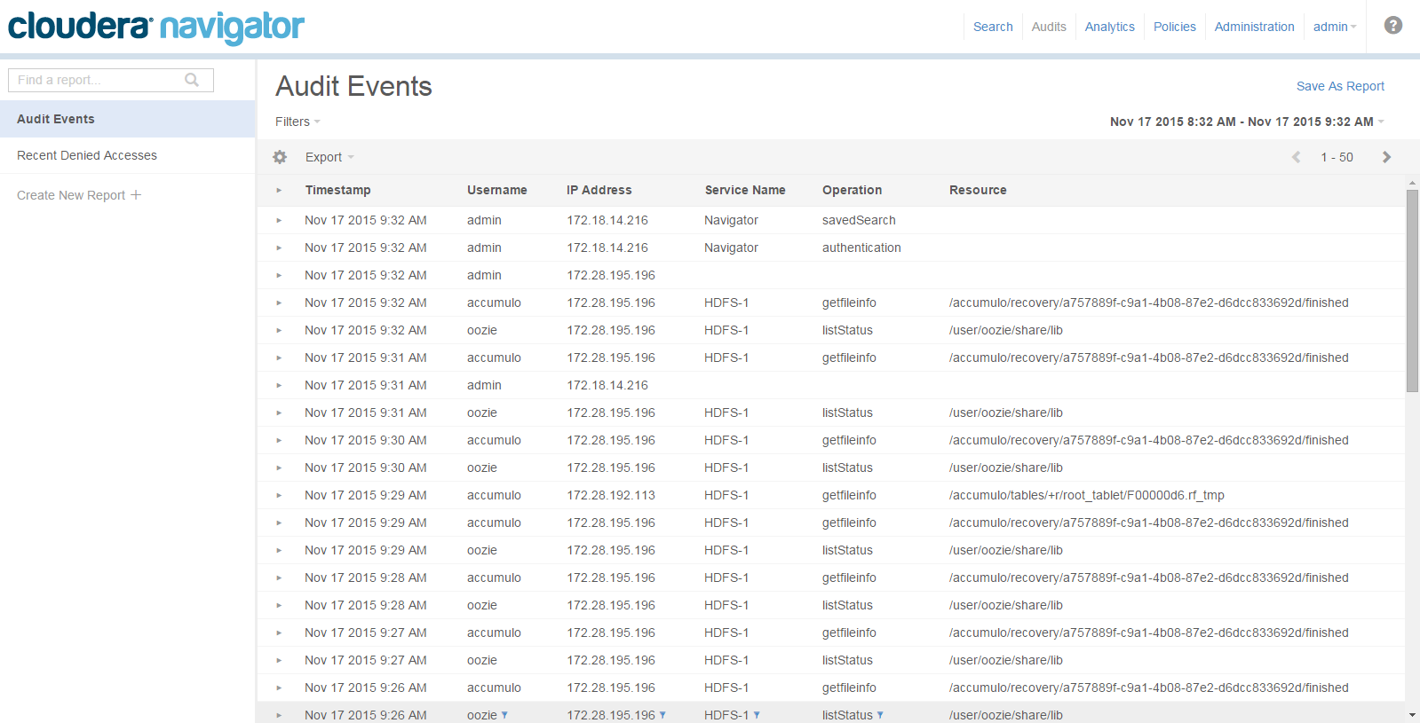 | Cloudera Navigator | Audit events captured by Cloudera Navigator itself |