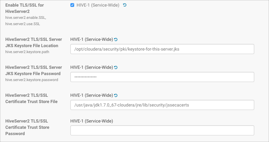 Property Description Enable TLS/SSL for HiveServer2 Click the checkbox to enable encrypted client-server communications between HiveServer2 and its clients using TLS/SSL. HiveServer2 TLS/SSL Server JKS Keystore File Location Enter the path to the Java keystore on the host system. For example: /opt/cloudera/security/pki/server-name-server.jks