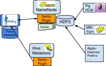 The NameNode loads a Sentry plugin that caches Sentry privileges as well Hive metadata. This helps HDFS to keep file permissions and Hive tables privileges in sync. The Sentry plugin periodically polls Sentry to keep the metadata changes in sync.