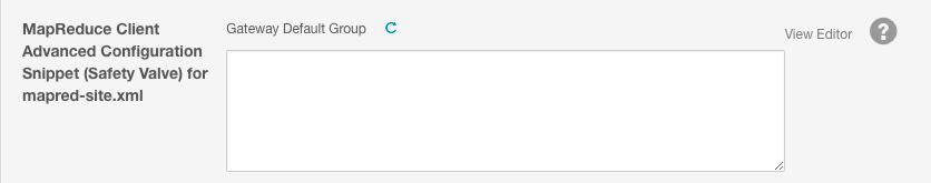 - In the Search field, enter MapReduce Client Advanced Configuration Snippet (Safety Valve) to find the safety valve on one of YARN's gateway nodes: